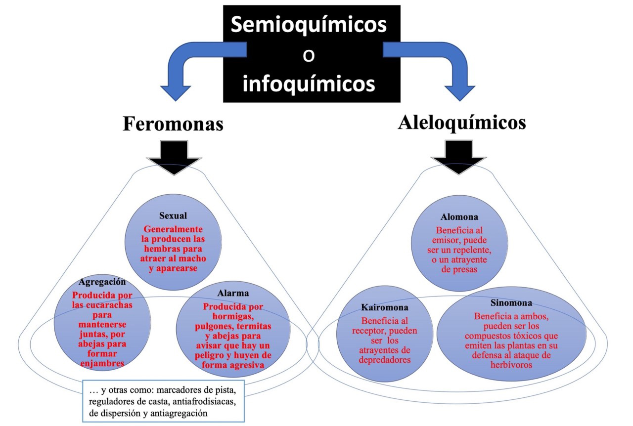 La comunicación química siempre involucra el intercambio de mensajes donde un individuo juega el papel de emisor y otro de receptor. Estos compuestos desencadenan en los insectos una variedad de comportamientos, tales como: busqueda de alimento o sitios de oviposición, busqueda de pareja para el apareamiento sexual, marcaje de algun área, entre otros (Dicke y Sabelis, 1988). Los semioquímicos o infoquímicos (generalmente son mezclas que están compuestas por terpenos, derivados de ácidos grasos y compuestos aromáticos) incluyen tanto a las feromonas como a los aleloquímicos. La feromona, es un infoquímico que media una interacción entre organismos de la misma especie, donde el beneficio puede ser del emisor, del receptor o de ambos. Un aleloquímico, es un infoquímico que media una interacción entre dos organismos que pertenecen a especies diferentes (Fig. 2).