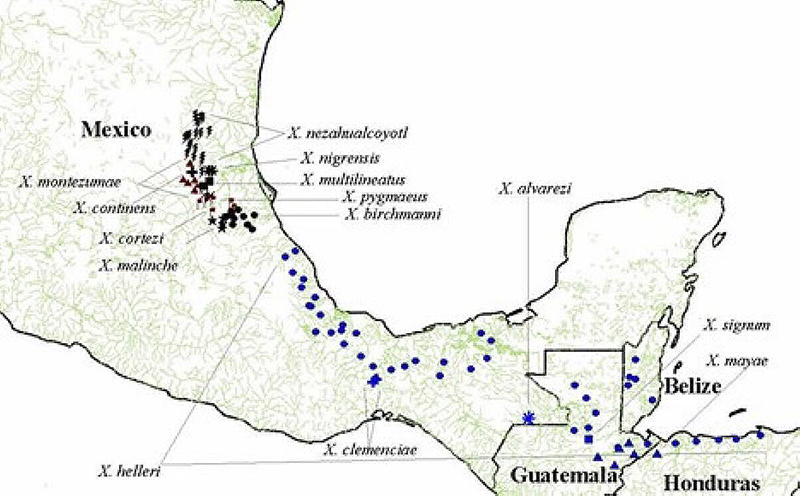 El género de peces Xiphophorus se encuentra dentro de esta familia y a varias especies se les conoce comúnmente como peces cola de espada. El nombre común de estos peces se debe a que los machos sexualmente maduros tienen una espada, que es una elongación de la parte ventral de su aleta caudal o cola (Fig. 1). Las hembras sexualmente maduras tienen una mancha negra en su abdomen que rodea los órganos reproductores y no tienen espada (Fig. 1). Los peces cola de espada están divididos en dos grupos, el del norte, formado por nueve especies de peces nativos de México, que se distribuyen al norte del Río Nautla, en diferentes afluentes del Río Pánuco, en los estados de Tamaulipas, San Luis Potosí e Hidalgo. El grupo del sur está formado por ocho especies que se distribuyen al sur del Río Nautla, en ríos del estado de Veracruz, así como en Belice, el norte de Guatemala y de Honduras (Fig. 2).