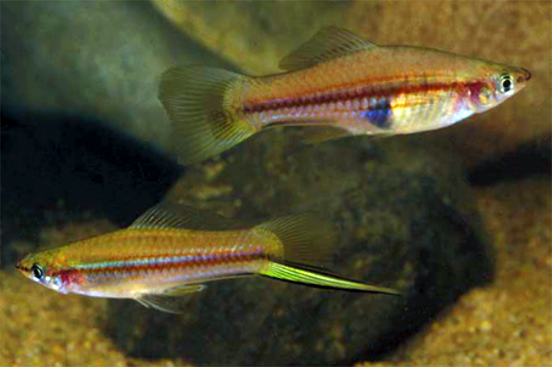 Slider: Macho tramposo (abajo) y cortejador (arriba) del pez cola de espada pigmeo con joroba Xiphophorus multilineatus. Fotos de Kevin De Queiroz.