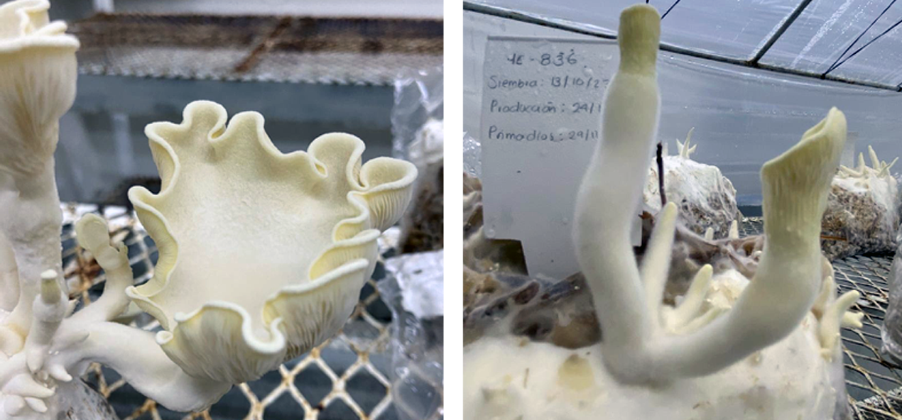 Pleurotus agaves cultivado en el laboratorio de Biotecnología de Hongos Medicinales y Comestibles del INECOL. a) Basidioma en estado de madurez, b) estípite alargado.