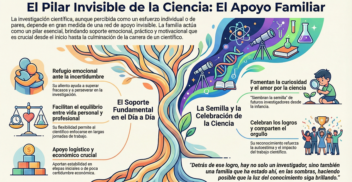 Finalmente, aunque la investigación científica suele ser vista como una labor individual o colaborativa entre “pares”, detrás de cada científico hay una red de apoyo que hace posible su trabajo. La familia, con su amor, comprensión y sacrificio, es un pilar esencial en este proceso. Reconocer y valorar este apoyo no solo es un acto de gratitud, sino también una forma de recordar que la ciencia, al igual que la vida, es un esfuerzo colectivo y de apoyo permanente entre todos, especialmente derivado de la cercanía de afectos. Así, la próxima vez que leas sobre un descubrimiento científico, recuerda que, detrás de ese logro, hay no solo un investigador, sino también una familia que ha estado ahí, en las sombras, haciendo posible que la luz del conocimiento siga brillando.