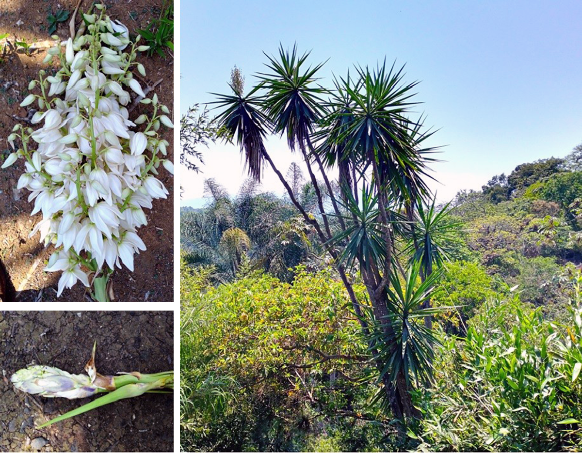Figura 1. Flores y hábitat de planta del izote (Yucca gigantea Lem.). Foto: J. Pale