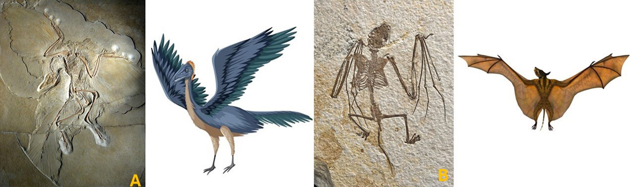 Algunos de los fósiles de vertebrados destacados: A) Archaeopteryx un ave primitiva evidencia de la transición evolutiva entre dinosaurios y aves, descubierto en Alemania en 1861, de unos 150 millones de años. B) Icaronycteris, un murciélago antiguo, ya capaz de volar y probablemente de usar la ecolocación. Vivió hace 52 millones de años, hallado en la Formación Green River en Wyoming, EE.UU. Imágenes: internet