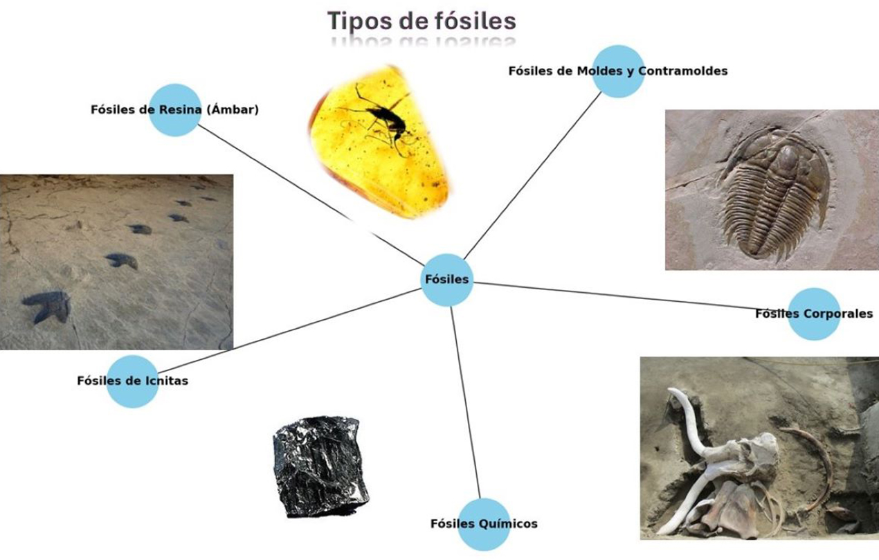 Diferentes tipos de fósiles, incluyendo fósiles de resina (ámbar), fósiles de moldes y contramoldes, fósiles corporales, fósiles químicos y fósiles de icnitas, ilustrados con ejemplos visuales.