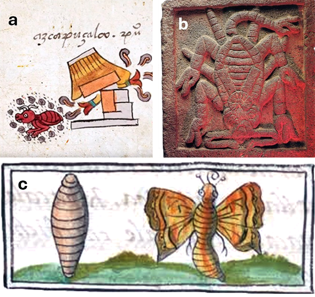 Fig 1. a) Representación Mexica de las hormigas y que da nombre a la localidad de Azcapotzalco. b) Representación en piedra de un alacrán conocido como cólutl o el “enroscado”. c) Pupa y adulto de una mariposa en el Códice Florentino, libro XI fol. 103v. El dibujo muestra la noción que tenían las culturas prehispánicas de la metamorfosis que sufren estos insectos en su desarrollo