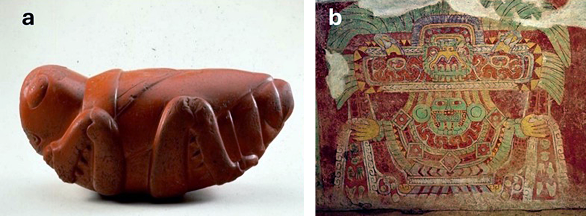 Fig 2. a) Escultura Mexica en piedra representando un chapulín. b) Mujer araña de Teotihuacán. Representación de una gran diosa de esta legendaria cultura