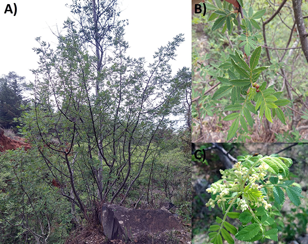 (A) Árbol de copal: Bursera cuneata. (B) Acercamiento del fruto y (C) flor. Crédito: Yessica Rico