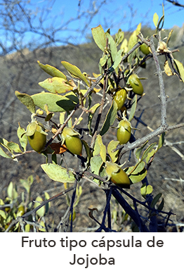 La Jojoba incluye arbustos que pueden llegar a medir hasta 3.5 m de altura, de hojas pequeñas y gruesas, las flores también son pequeñas, de color verde-amarillentas, y se distinguen en femeninas y masculinas, que se desarrollan en plantas separadas, es decir, hay plantas hembra y plantas macho. El fruto es una cápsula brillante que contiene una sola semilla (Fig. 1, 2). La especie es nativa del Desierto Sonorense, en particular del noroeste de México en la península de Baja California y Sonora y zonas adyacentes en Arizona y California (Fig. 3, 4), si bien, ha sido introducida en Sudamérica, Europa, Asia y África.