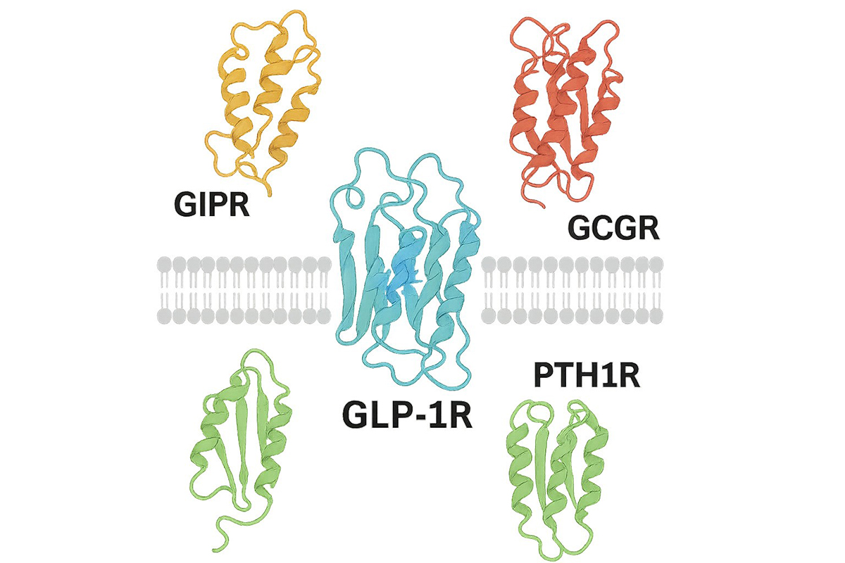 Primero hay que aclarar que el GLP-1 (glucagon-like peptide-1) es una hormona intestinal que estimula la secreción de otra hormona muy importante, la insulina, mediante la unión a su receptor GLP-1R. Posteriormente la insulina inhibe la liberación de glucagón y ralentiza el vaciado gástrico, lo que contribuye a una sensación de saciedad prolongada. Estos efectos combinados han generado un “boom” terapéutico, ya que GLP-1 se ha convertido en una herramienta tanto para el control de la glucemia como para la pérdida de peso. También cabe mencionar que esta hormona se une a proteínas específicas que están en la membrana celular y se denominan receptores acoplados a proteínas G (GPCRs, por sus siglas en inglés); estos receptores cumplen con múltiples funciones celulares cuando sus hormonas ligantes se acoplan. Por ejemplo: