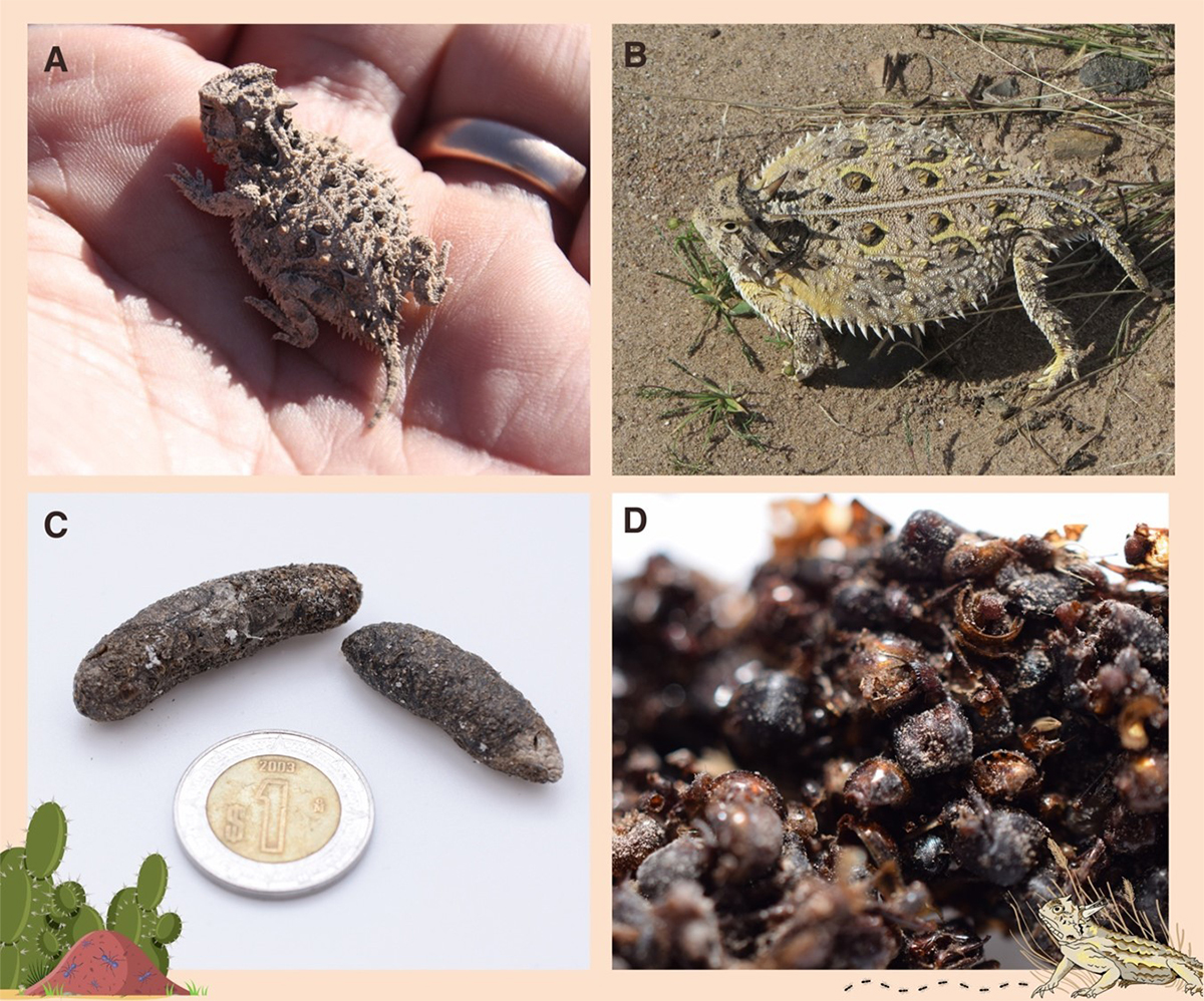Fig 1. A) Cría de Phrynosoma cornutum fotografiada en la Reserva de la Biósfera Mapimí; B) Hembra de P. cornutum en actitud defensiva; C) Excretas de Phrynosoma con moneda para escala; D) Observación a detalle de exoesqueletos de hormigas en las excretas. Fotografías A y B cortesía de AGR; C y D de JRL. Jorge Ramos Luna