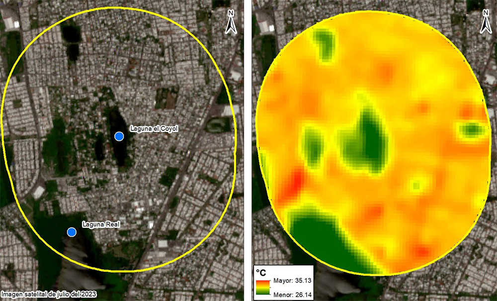 En la escena izquierda se muestra una imagen satelital Sentinel donde se observan lagunas interdunarias de la ciudad de Veracruz. En la escena derecha se muestra una imagen de la temperatura superficial en donde las zonas más calientes son las más cercanas al rojo y las más frías las más cercanas al verde.Las lagunas interdunarias y los beneficios que proveen