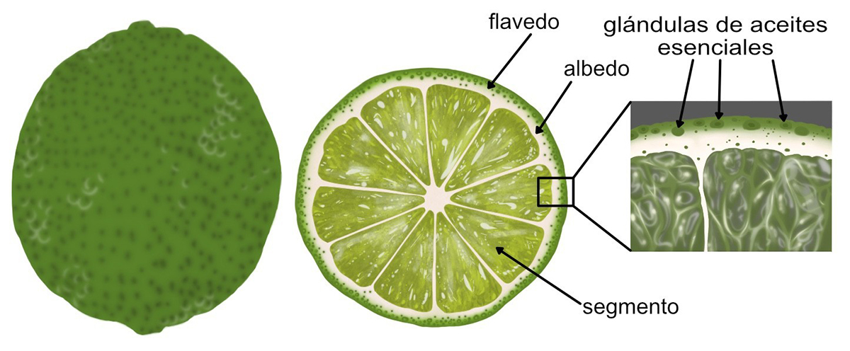 Diagrama que representa la estructura de la cáscara del limón Persa y sus partes. Crédito: Rebeca Escamilla y Andrea Birke