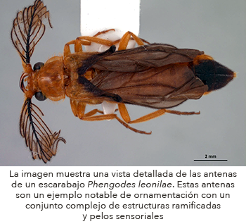 Slider: La fotografía captura un primer plano de la antena de un escarabajo ambrosiano Xyleborus ferrugenius, revelando un microcosmos de estructuras sensoriales. Estas estructuras, denominadas sensulos, se presentan en diferentes formas y tamaños, cada una con una función específica en la percepción del insecto. Fotografía: Greta H. Rosas Saito