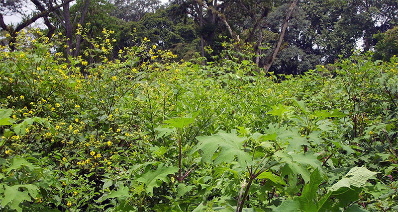A nivel mundial, cerca de 30 especies de moscas Tephritinae se han empleado como agentes de bio-control de malezas, principalmente en EUA, Canadá, Europa, Hawaii, Australia, Nueva Zelanda y Sudáfrica [5]. En Latinoamérica el uso de estas moscas ha sido limitado, no obstante, se han exportado con éxito algunas especies a otras regiones del mundo. Por ejemplo, moscas inductoras de agallas como Procecidochares utilis, especie originaria del estado de Morelos que es utilizada para bio-control de Ageratina adenophora (Asteraceae) nativa de México[6]; y la mosca Eutreta xanthochaeta originaria del estado de Veracruz que se usa para el bio-control de Lantana camara (Verbenaceae) [7], conocida localmente como “cinco negritos” o “lantana”. Ambas plantas son especies invasoras en muchas regiones del mundo (Figura 3).