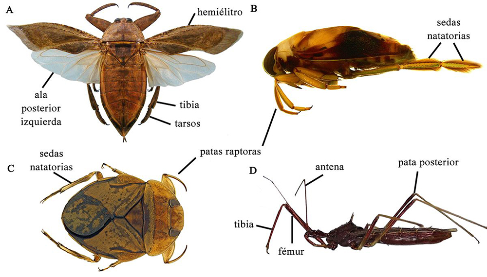 Distintas modificaciones en patas de chinches. (A) Patas frontales raptoras y tibias y tarsos de patas posteriores aplanados en la chinche acuática Lethocerus collosicus. (B) Patas anteriores raptoras y posteriores alargadas con sedas natatorias en la chinche acuática Notonecta sp. (C) Patas frontales raptoras y tibias posteriores con sedas natatorias en la chinche acuática Limnocoris signoreti. (D) Patas frontales raptoras en la chinche terrestre Isocondylus sp. Fuente: Ximena Galindo-Malagón y Daniel Reynoso-Velasco.