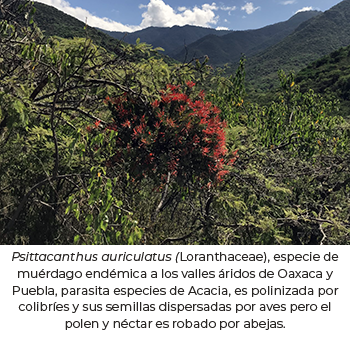 Por lo tanto, es fundamental secuenciar el genoma de un mayor número de especies de plantas parásitas para tener un entendimiento más amplio de la evolución y función del parasitismo en plantas. Actualmente, se realiza investigación para obtener el genoma de un múerdago (Psittacanthus auriculatus), una especie hemiparásita endémica a los valles áridos de Oaxaca y Puebla y cuyo genoma permitirá establecer un marco de referencia para el análisis ecológico y evolutivo del hemiparasitismo, permitiendo abordar temas que actualmente son poco entendidos como son los mecanismos moleculares de la interacción entre el hospedero y la planta parásita.
