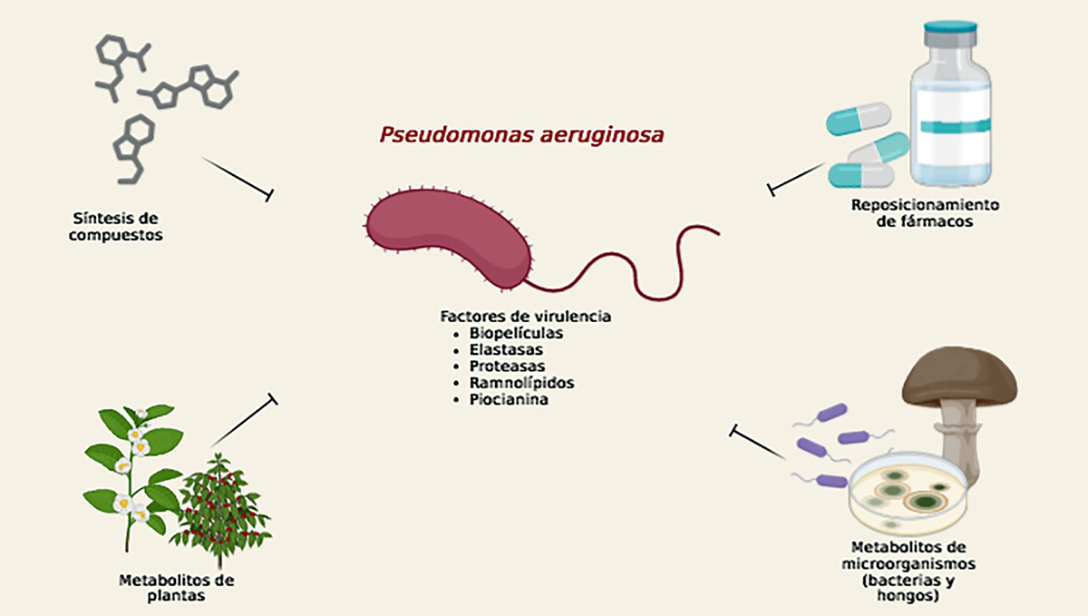 Recientemente, una de las alternativas en el control de la virulencia de P. aeruginosa es la búsqueda de moléculas que inhiban la producción de factores de virulencia de la bacteria sin generar una resistencia bacteriana afectando el QS de estas. Este mecanismo de inhibir el QS de la bacteria ha sido descrito como “quorum quenching” o inhibición del quorum de tal manera que las moléculas bloquean o inactivan la molécula señal propia de la bacteria afectando la virulencia de la bacteria. Diversos estudios han mostrado que la obtención de moléculas a partir de extractos vegetales y/o microorganismos, la síntesis o el reposicionamiento de moléculas similares a las “moléculas señal” del QS representan una alternativa prometedora en el control de la virulencia de la bacteria sin dar origen a resistencia como los antibióticos convencionales (Fig. 3).