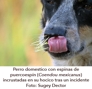 Por lo anterior, los puercoespines no suelen tener muchos depredadores naturales, algunos que se atreven a consumirlos ocasionalmente son; el ocelote, el coyote y esporádicamente aves rapaces nocturnas. Sin embargo, las principales amenazas que enfrenta esta especie se deben a factores específicos de su entorno o a la presión humana en su hábitat como; la deforestación, los atropellamientos en carreteras y brechas, los enfrentamientos constantes con perros domésticos quienes con frecuencia sacan la peor parte y resultan gravemente heridos (figura 3). Sin embargo, es preciso mencionar que ellos nunca buscan pelea y solo se defienden ante los ataques, además somos nosotros los humanos y nuestros animales domésticos los que invadimos su hábitat haciendo esos encuentros cada vez más frecuentes.