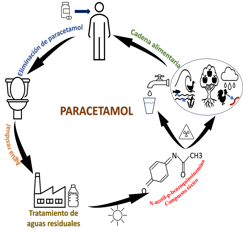 Nosotros lo eliminamos principalmente por la orina, en menor proporción por las heces y también la desechamos directamente en la basura de nuestra casa, a través de empaques a medio usar o bien cuando estos caducan. El paracetamol, generalmente llega disuelto a las aguas domésticas y urbanas (aguas residuales), pero es resistente a los procesos que se utilizan para tratarlas, por lo que en ellas puede acumularse y transformarse en compuestos tóxicos cuando cloran el agua, en este punto puede resulta ser nocivo, sobre todo cuando se vierte descontroladamente al medio ambiente (Figura 1), provocando afectaciones a las especies y el área donde viven (ecosistema).