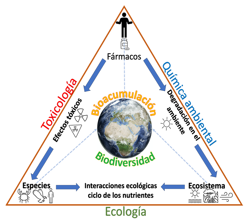 La realidad es que muchos de los fármacos que consumimos, son contaminantes ambientales de gran importancia. Por esa razón, es primordial conocer su origen y la interacción de los compuestos tóxicos (ecotoxicología) que se derivan de ellos, la manera en la que se transportan por el aire, agua y suelo (química ambiental), como persisten en el ambiente y se pueden acumular (bioaumulación), las vías de contacto en el ecosistema, así como, la forma en la que provocan efectos negativos en el ambiente y en los seres vivos (biodiversidad), y el impacto que provocan en su salud (toxicología) (Figura 3).
