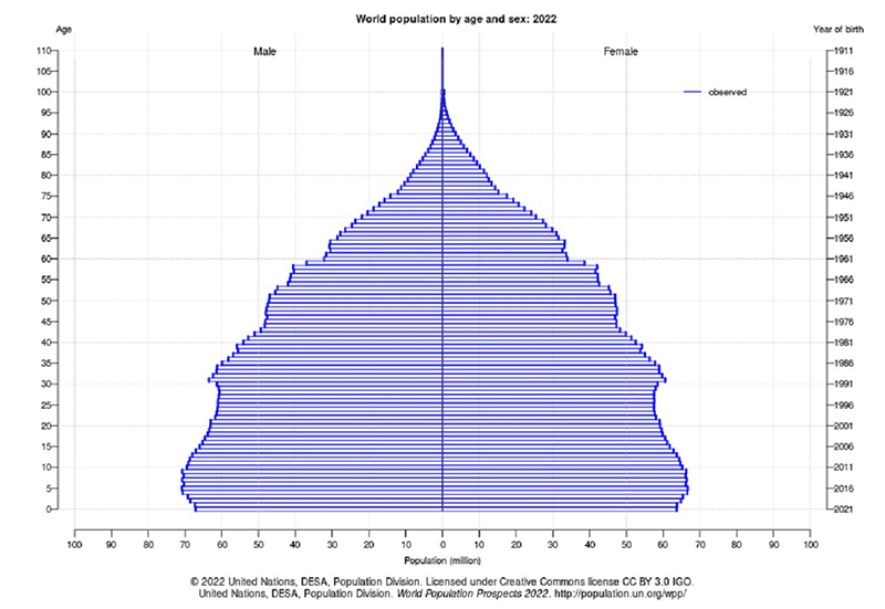 Es probable que el habitante número 8 mil millones nazca en Asia, pues en ese continente vive más de la mitad de la población humana; 29% en Asia oriental y el sudeste asiático, y 26% en Asia central y del sur. Sabemos también que en Asia están los dos gigantes poblacionales del mundo, China (1.43 mil millones de habitantes) y la India (1.42 mil millones) – naciones muy cercanas en población, y se estima que el año entrante, India sobrepasará a China. Usando las agrupaciones de países de la ONU, África subsahariana y la combinación de Europa más Estados Unidos y Canadá, ambas regiones tienen poblaciones por encima de los 1’100 millones de personas; mientras que en América Latina y el Caribe somos 658 millones de habitantes y en el norte de África y Oriente Medio viven 549 millones de personas. Si gustan consultar las cifras exactas, así como el informe completo de la División de Población de la ONU, les recomiendo visitar el sitio: https://population.un.org/wpp/Publications/