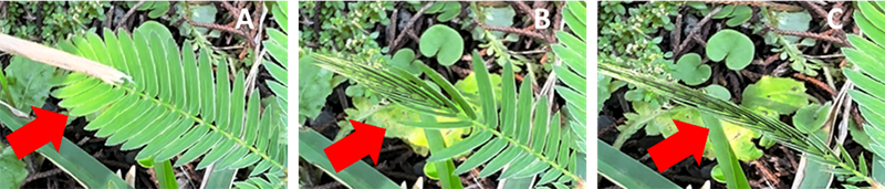 Hojas compuestas de M. pudica. Completamente “abiertas” previo al tacto (A), algunas décimas de segundo después el tacto (B) y completamente “cerradas” tras percibir el estímulo (C)