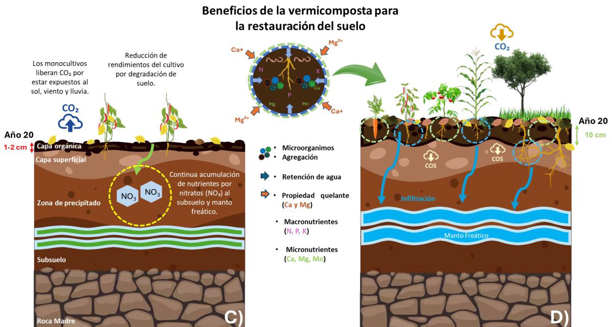 Fig 2. Restauración de suelos. C) Después de 20 años de explotación del suelo agrícola las capas superficiales, en especial la orgánica se habrían reducido hasta en un 90%, el suelo esta degradado y no aporta buen soporte para el desarrollo vegetal. D) Después de la aplicación paulatina de vermicomposta los suelos se restaurarían, ya que esta provee beneficios al suelo, entre ellos: incremento la materia orgánica, aumento en la eficiencia de los fertilizantes sintéticos, reactivación de la fauna del suelo, captura CO₂ e incremento en las reservas de carbono en suelo (COS), restablecimiento de la rizosfera, incremento en la resiliencia vegetal y recuperación de los servicios ecosistémicos. Crédito: Autores